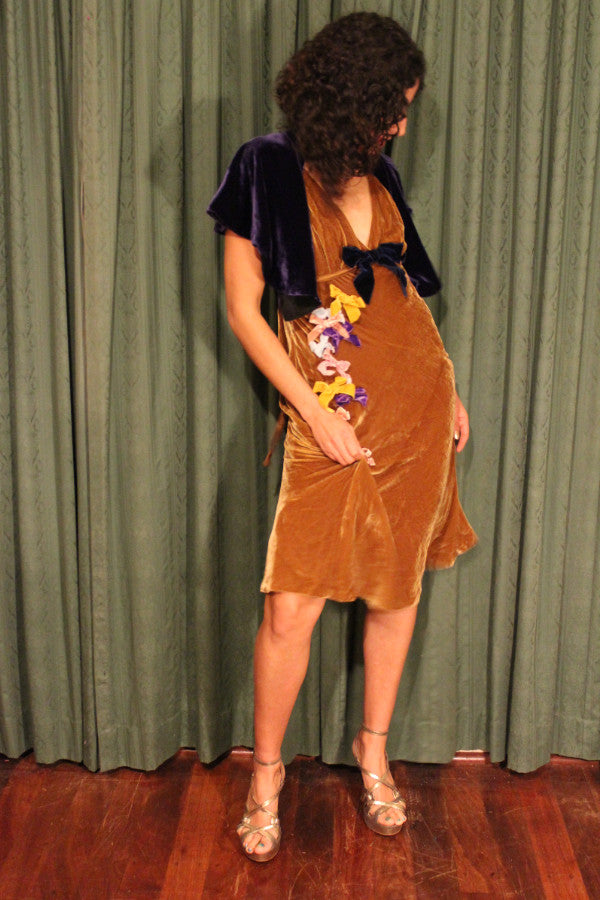 A touch of whimsy dances over this dress in the shape of little scattered bows on mustard velvet